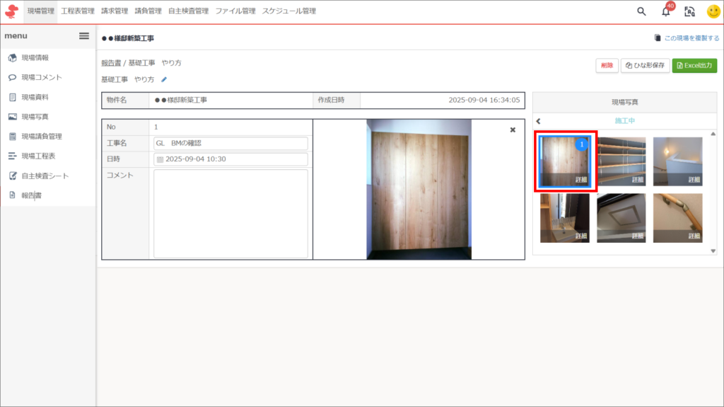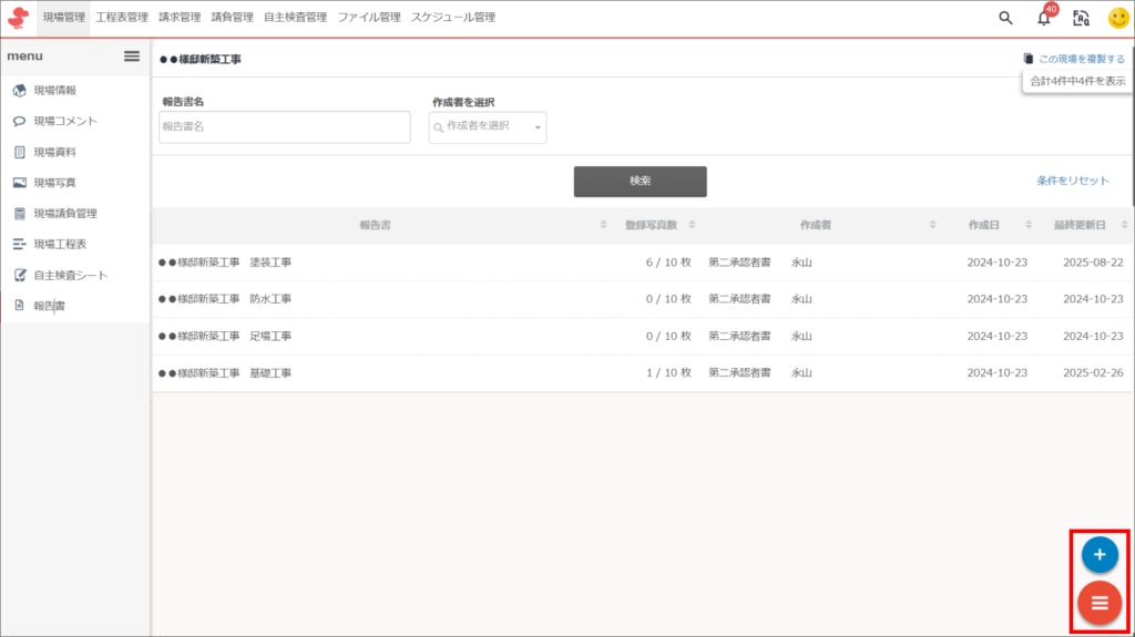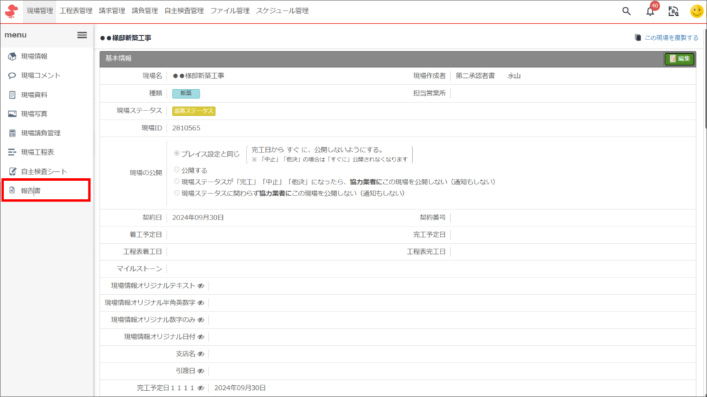 ①現場名をクリックした後、左メニュー内「報告書」をクリック