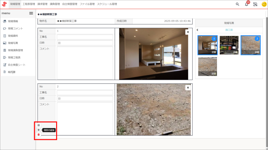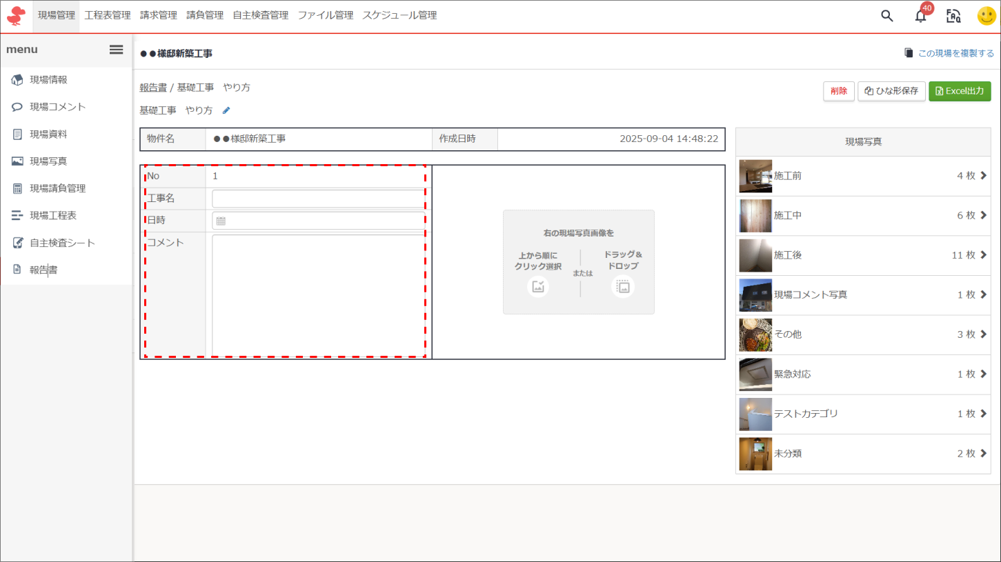⑤「工事名」「日時」「コメント」を入力