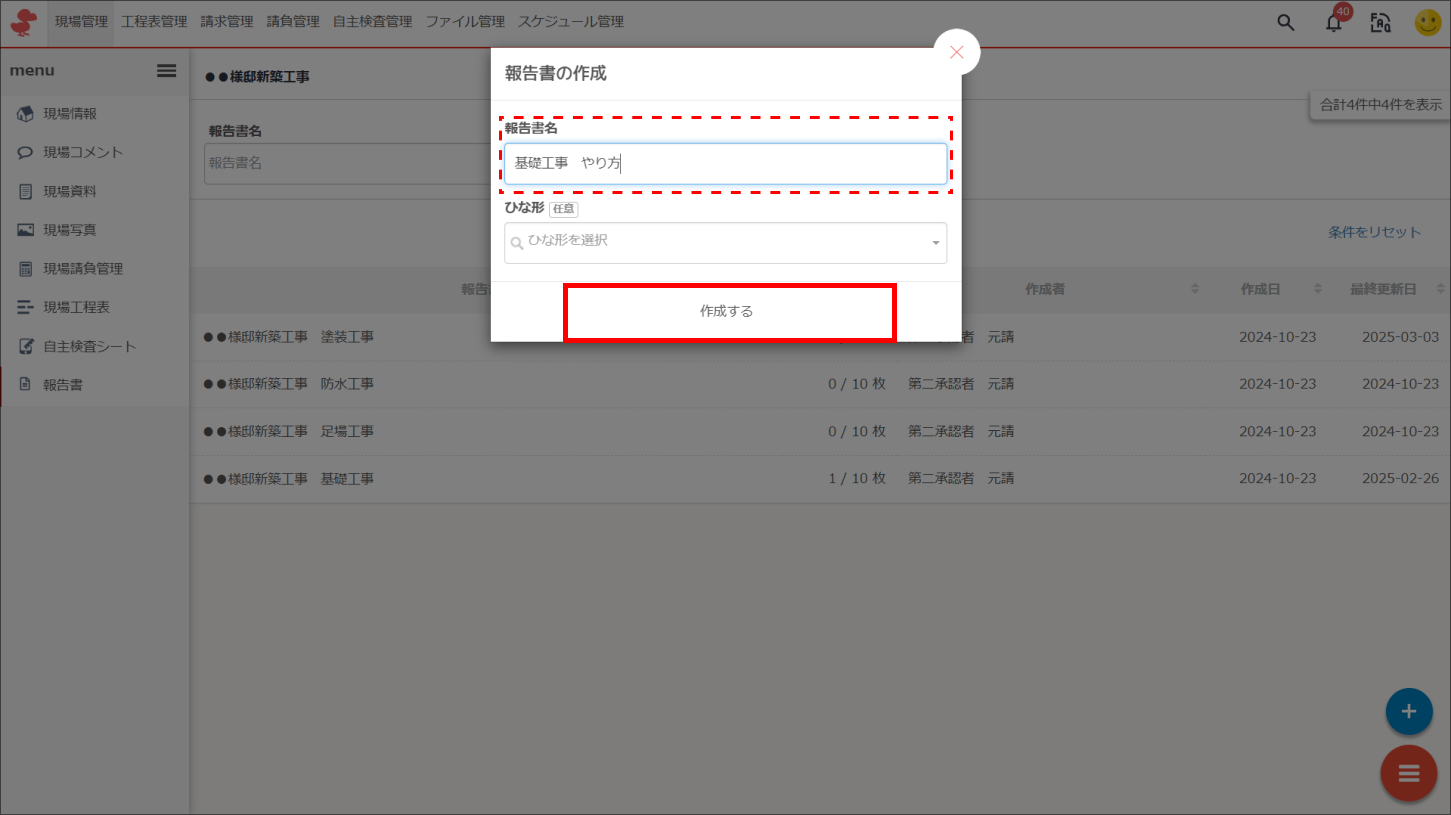 ③報告書名を入力し、「作成する」をクリック(必要に応じてひな形も選択してください。)