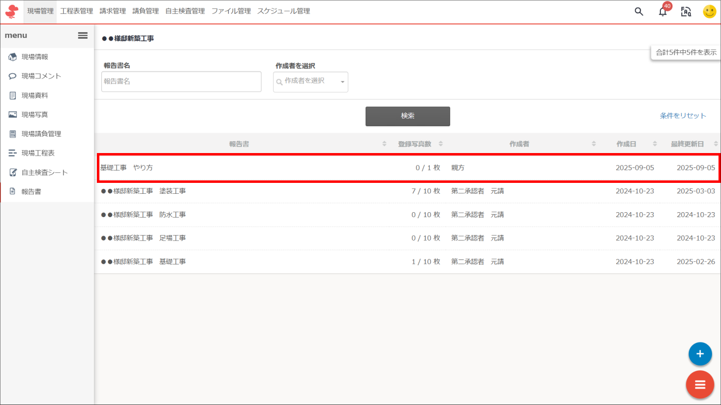 左メニュー内に「報告書」項目が表示されない場合は元請会社様にご連絡ください。