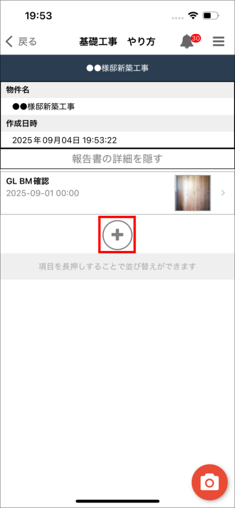 ②画面右下の赤い三本線ボタンをタップし、「+(報告書を作成)」をタップ