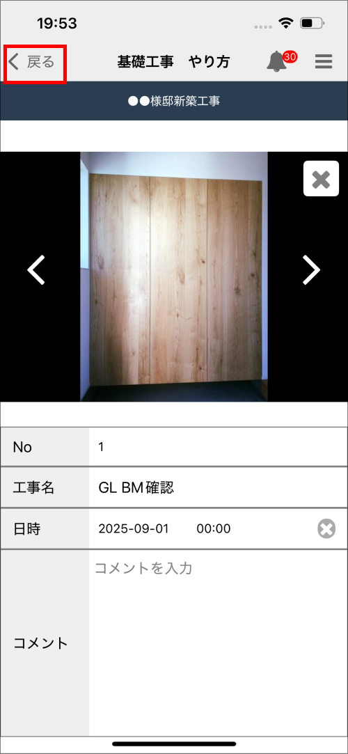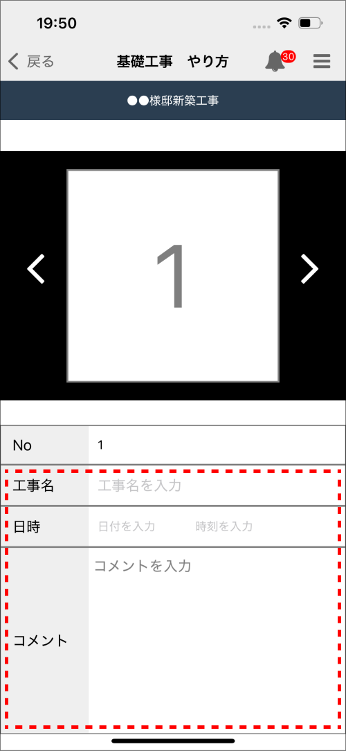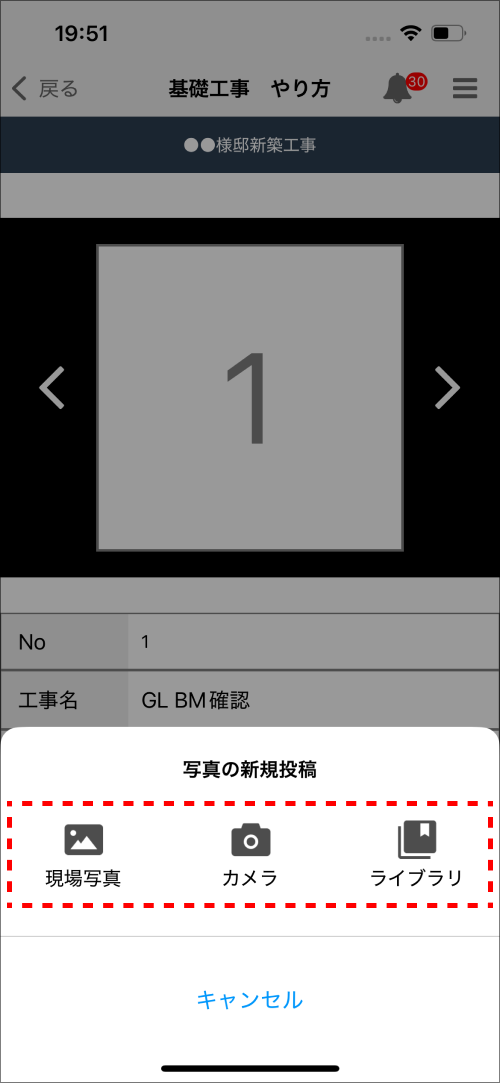 ⑦「現場写真」「カメラ」「ライブラリ」のいずれかをタップし、画像を登録