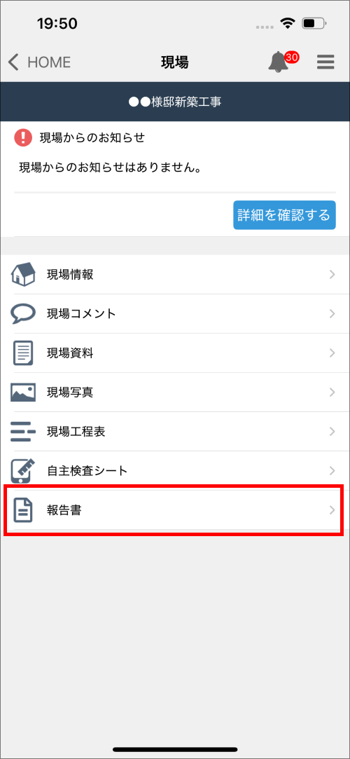 左メニュー内に「報告書」項目が表示されない場合は元請会社様にご連絡ください。