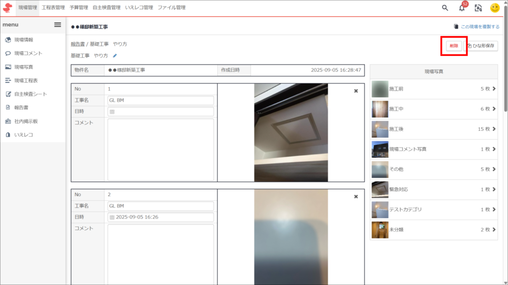 元請・ブラウザ協力会社・ブラウザ 報告書を削除するにはどうすればよいですか。 以下の手順で報告書を作成することが可能です。 ※一度削除した報告書は復元ができません。削除の際はご注意ください。 ①現場名をクリックした後、左メニュー内「報告書」をクリック ②削除したい報告書名をクリック ③「削除」をクリック ④確認事項にチェックを入れ、「はい」をクリック 参考になりましたか? はい 0 いいえ 0