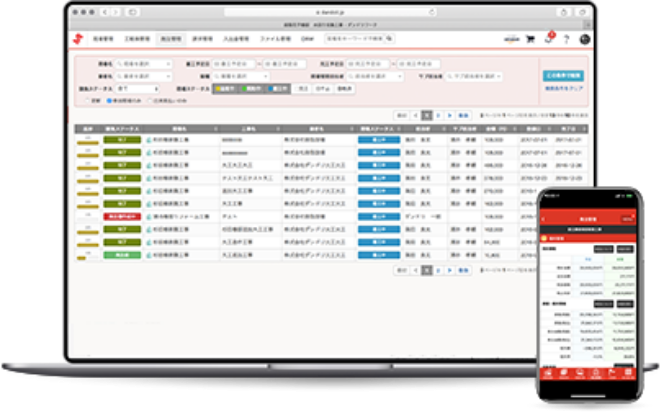 今までFAXや電話でやり取りしていた受発注業務をダンドリワーク内で一元管理できます。協力業者とのリアルタイムな受発注のやりとりにより、金額の相違を防ぎます。各現場の予実管理、月末の請求処理などに大きな効果を発揮します。