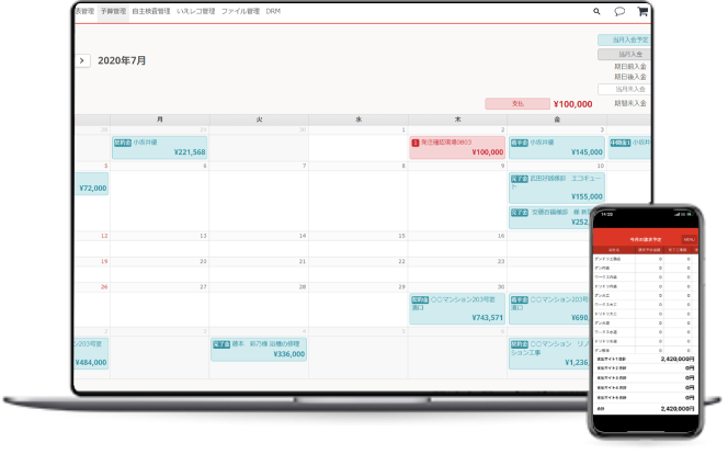 現場ごとに管理されている入金計画から作成された請求を網羅的にまとめて管理することができます。予算作成から原価が確定するまでをリアルタイムで管理し、粗利が下がるポイントを把握できます。